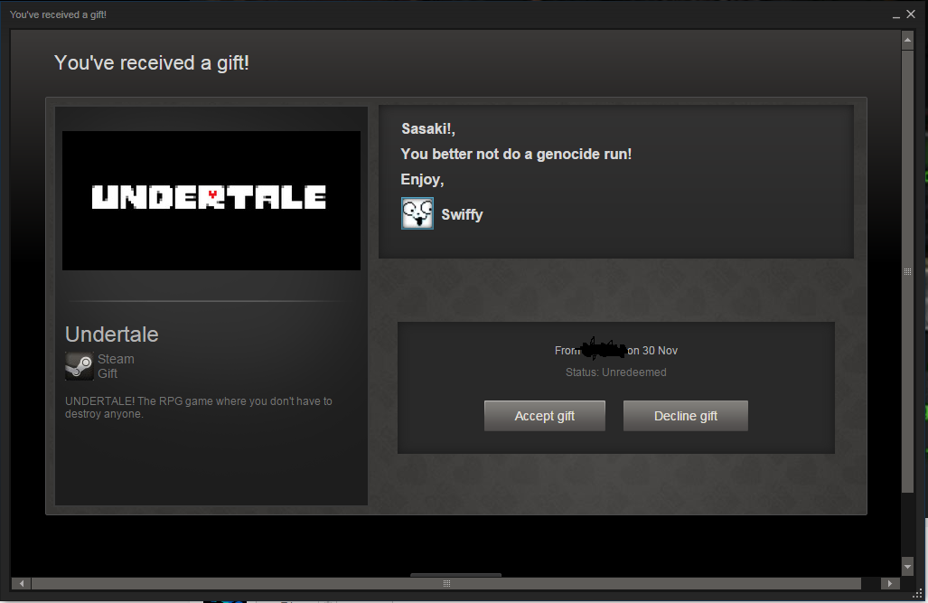 I got the game from swithreece, he PM'd me and gifted it to me.
