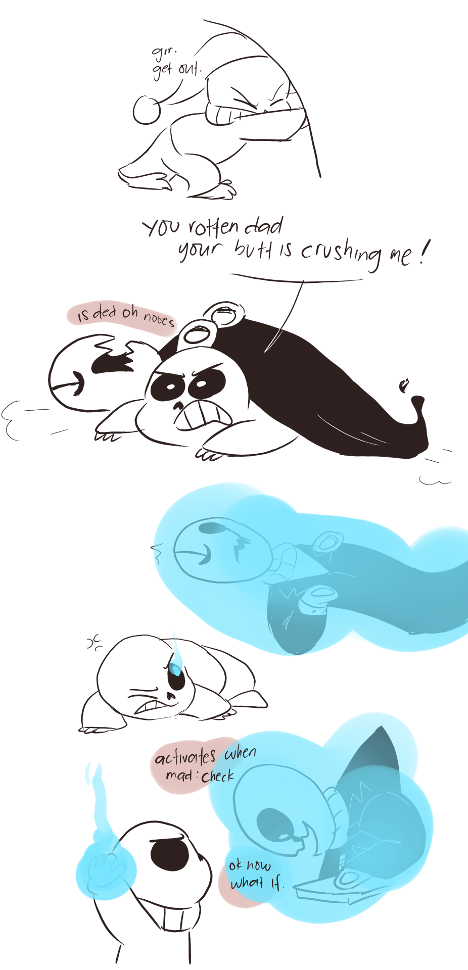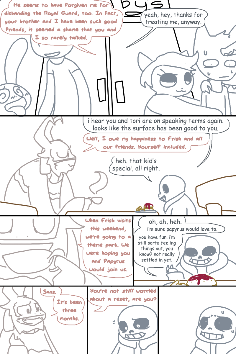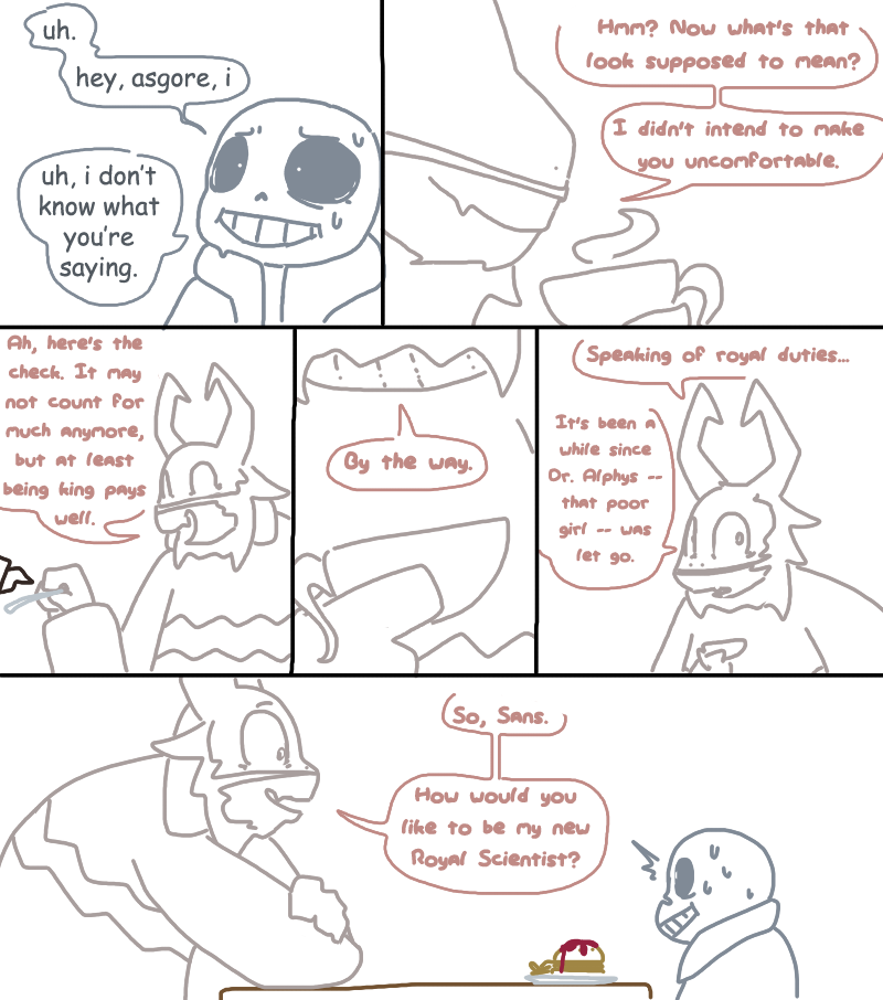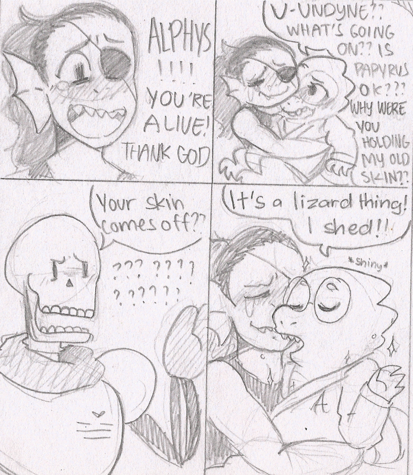 I love the idea of Papyrus and Undyne freaking out over Alphys. The whole reptile thing never sparked the idea in my mind that she'd actually shed her skin. I feel that'd be pretty much anyone's first reaction if they didn't know about an animal's ability to get rid of their old "shell".