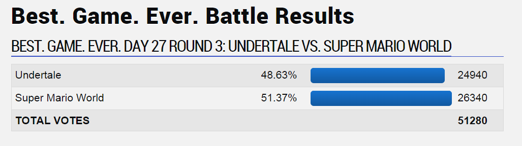 There are ones I understand even though I personally disagree, like Mass Effect 2 beating Starcraft, or EarthBound beating Borderlands 2, or Resident Evil 4 beating Fallout: New Vegas, but those 3, I would have put money on the game that lost being more popular.