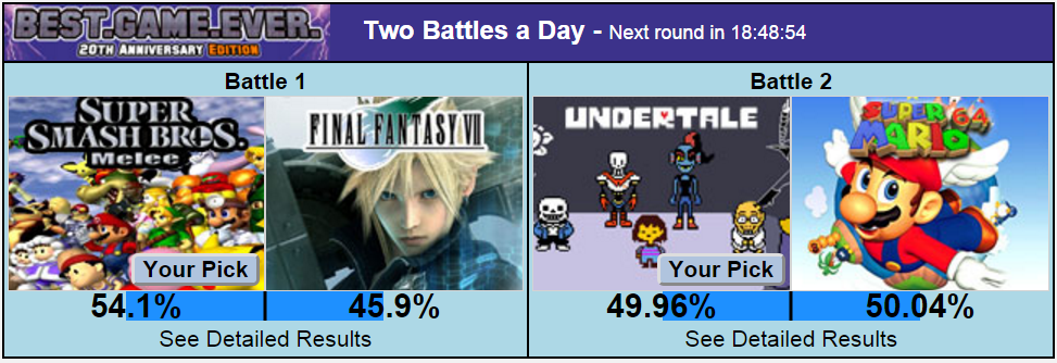 Wow, I thought Super Mario 64 would have crushed Undertale into the floor based solely on the principle of "HUR DURR MAH CHILDHOOD" alone. The cult following for this **** is crazy. To be honest I'm kinda rooting for it so we can have something that isn't Ocarina of Time as the best game of all time for once. Ever. Don't pretend Melee and Super Mario RPG stand a chance against it, we all know they don't.