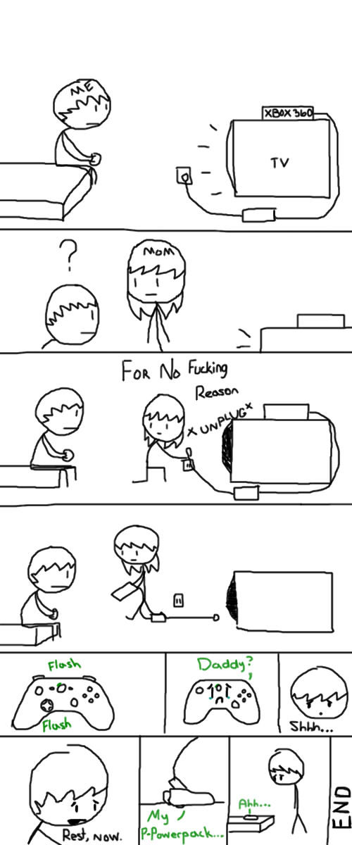 Somehow unplugging the xbox and tv and all that while they were on managed to severely **** up his xbox as well as his television. His xbox won't turn on at all since then, and the tv has an ugly "burn" mark down the middle, and the bitch didn't even apologize, or explain why she did it. She just ******* kicked over his sandcastle and walked away.