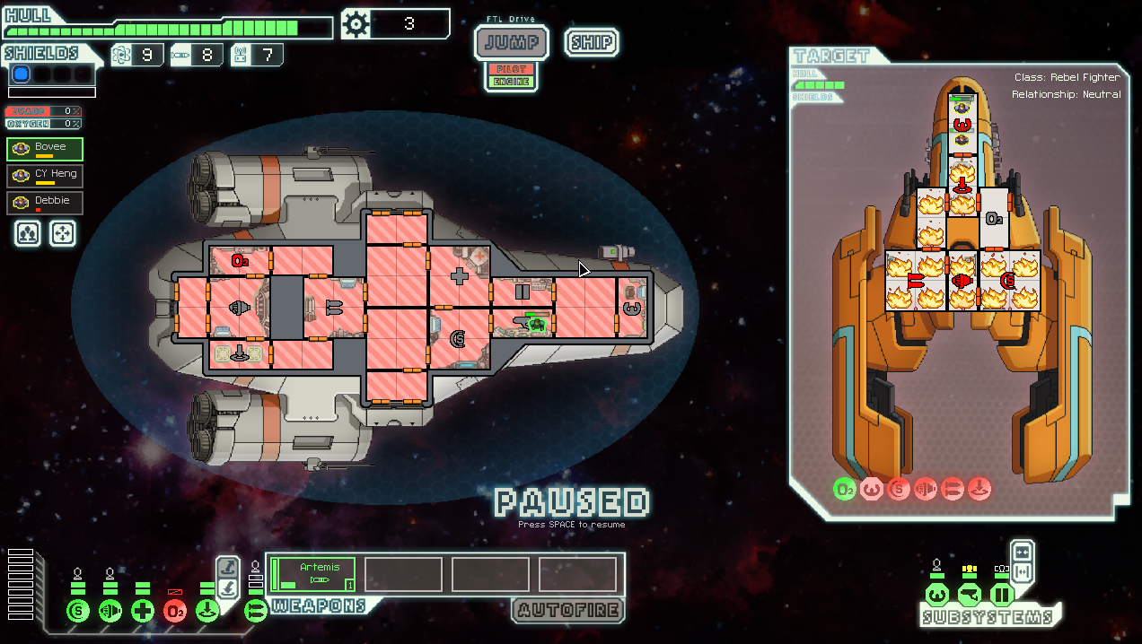 I fired a missile into the enemy's weapons system to disarm their ship, but it also caught the room on fire. To fight off an enemy boarder I opened all the doors to suffocate him, but I didn't notice my O2 system was destroyed.