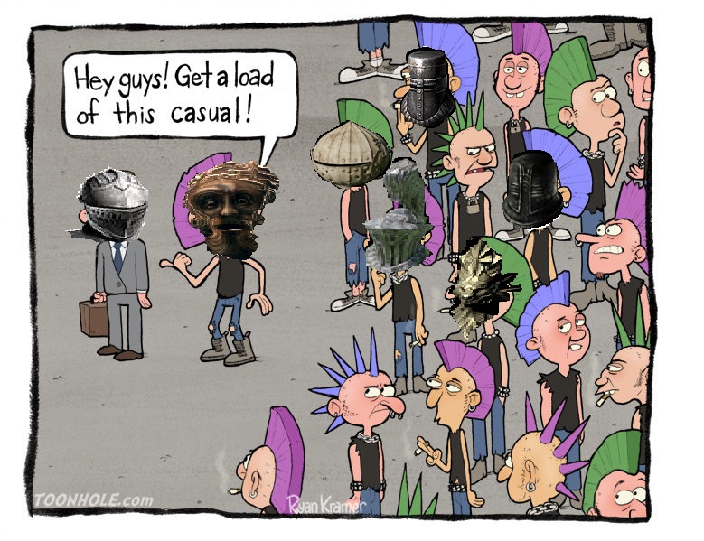 Dark Souls combat is shallow. Plus, the biggest annoyance in the game is the fact that in order to learn the bosses patterns, which will usually result in you being killed once or twice by "THAT ONE FRIGGIN' MOVE!", you have to go through the gauntlents to get in their area again. That does not inherit the definition of "hard", as many people seem to like believing. Add that to the fact that most mooks in the game are easily dispatched, and most deaths to them are due to mobing (reason why fat guy and pikachu are usually considered one of the hardest bosses), or being hit by someone out of range, or sight. In fact, let me sum up the general reasons of death in Dark Souls.
