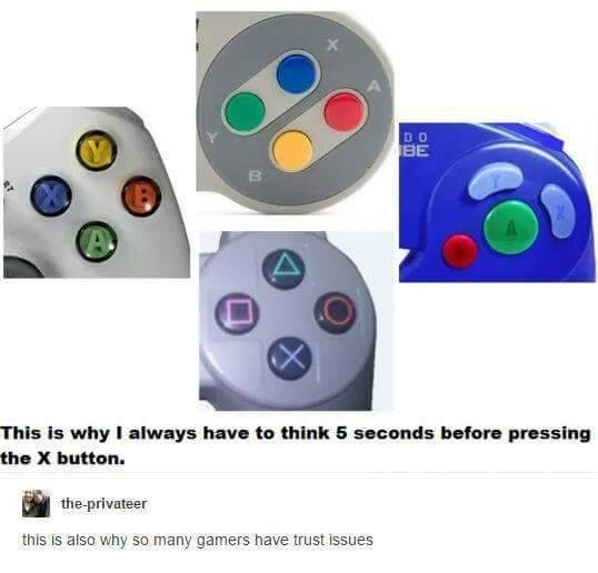 And yeah, most games key the buttons to the functions by button position, rather than button label, but there are often two different locations for that button function. "Jumping" for example is either the bottom ( A / B / X ) button, or the top ( Y / X / ∆ ) button. So if a game is telling you to "Press X to jump," it could be very confusing.