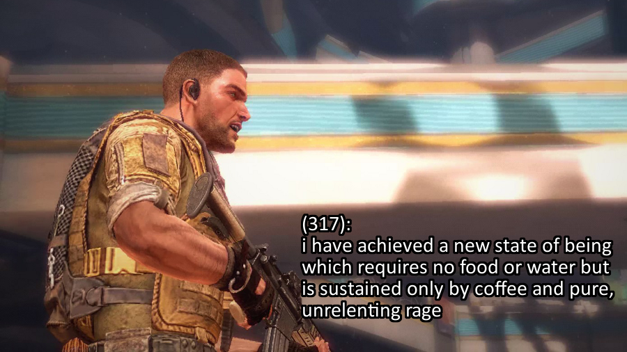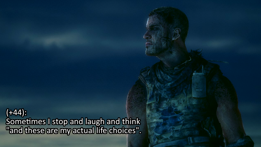 I think this is the most powerful part of Spec Ops as a player experience: every action Walker takes as a totally mentally deranged man is exactly the echo of the player in a video game who wants to complete a story, who wants to believe they're the good guy in a situation, and who wants to attribute faults to the world rather than their own failings. Walker is the video-game mentality in a realistic character, to the point where he can choose to shoot his rescuing force for the hell of it.