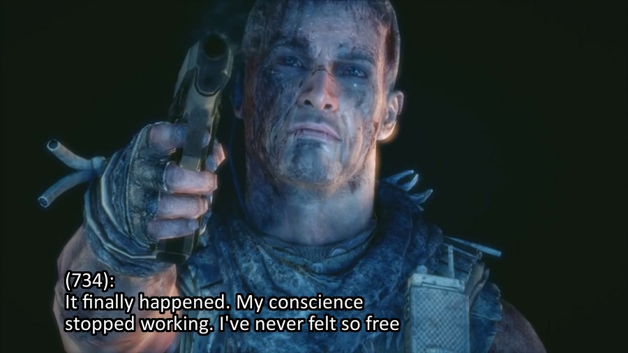 Also, you can't judge a criminally insane person by their actions, which is why nutters go to high security nuthouses instead of jail. The entire concept of seriously trying to judge whether the actions of a person who can't understand reality and shoots at people who aren't even there are morally sound is completely pointless. The real bad guys are his squad members, who are confirmed in the ending to be so ******* retarded that they seriously followed the orders of a madman who spoke into a broken radio and randomly fired at nothing without any question. How ******* incompetent do you have to be to follow someone who is obviously completely insane?