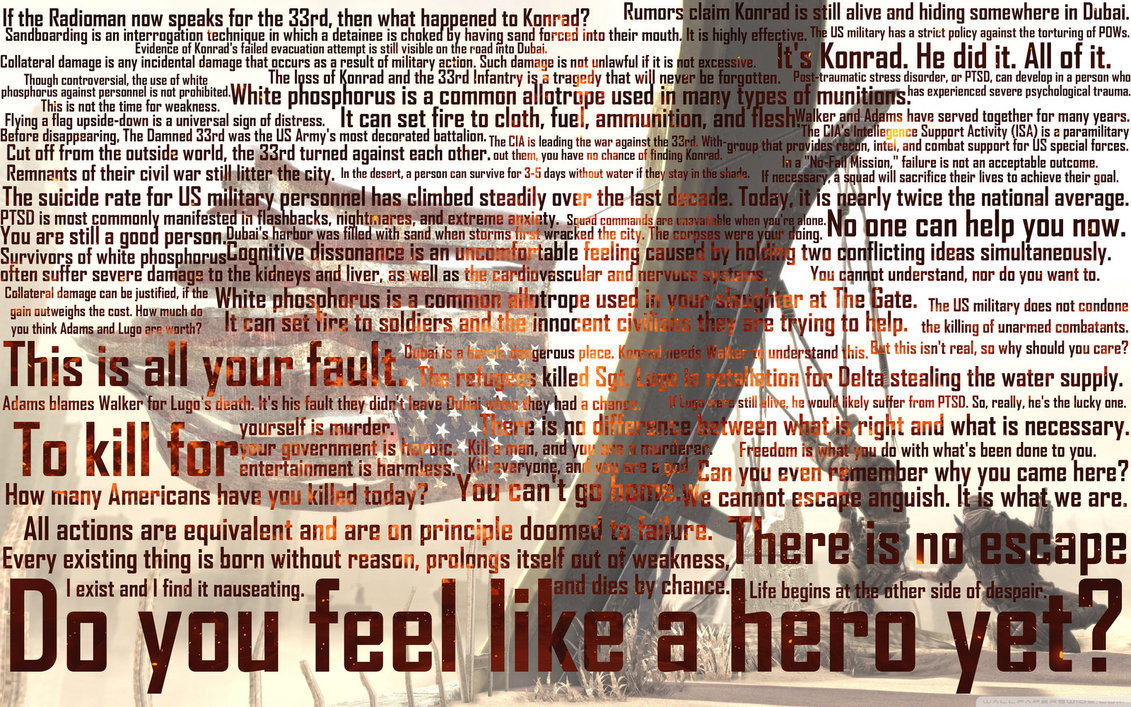 That makes no sense. I can see what you're trying to say but in a game that "mechanic" is so unintuitive it's retarded. This isn't global thermonuclear war, it's a ******* game. You learn how best to play a game based on the feedback it gives. Spec Ops plays out like any other game, so you treat it like every other game. There is no feedback for quitting the game that indicates it was the right choice, or even a viable one. Besides, Dubai presents itself as a mystery to be solved. Your whole reason for being there is to recon, "Find out what happened to Dubai". That is the main objective of the game, and the only way to achieve that is to finish it.