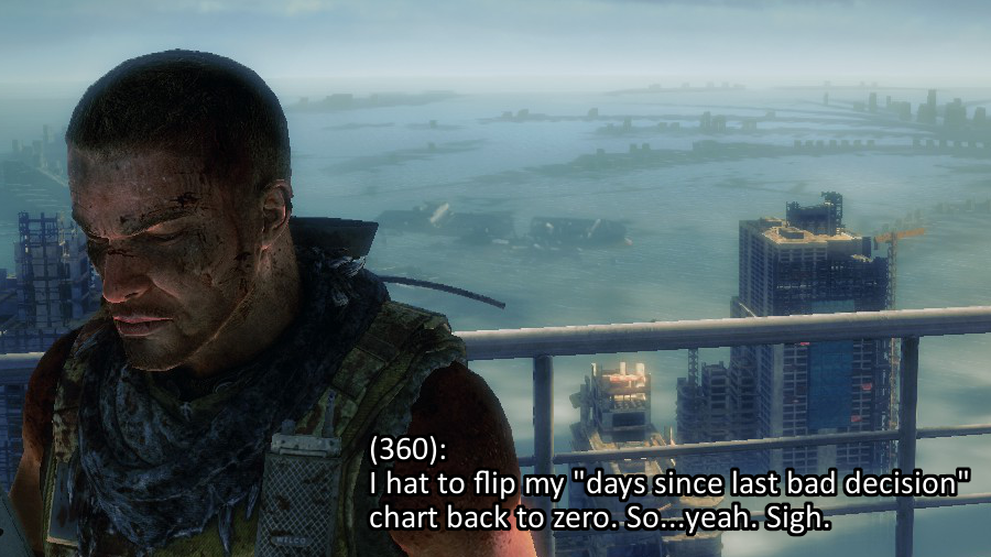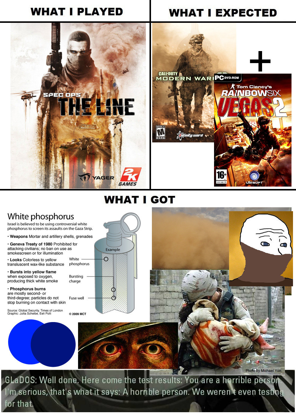 Without trying to sound like a pretentious douchebag, I get the feeling that people are missing the point of Spec Ops. I keep seeing people say stuff like, "But the game is **** because there is no choice." That's the point! A game can put players through a moral dilemma without offering them choice. The game constantly explores the question, "Can you feel bad about things out of your control?" And you can. The game takes every available opportunity to defy the expectations of the player, and this is no exception. In many ways, the game is like an exploration of the relationship between player and player character. Are we really in control of Walker, or do we just represent the last shred of self awareness in his increasingly psychotic mind, as he railroads us into committing atrocities, and our fear and distrust of him grows in parallel to the men under his command. If Spec Ops: The Line were a movie, none of this would be an issue, but because it is a game we have been conditioned to expect it to present things in a certain way, even though it doesn't have to.
