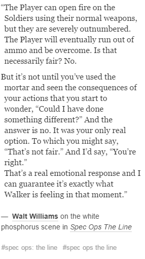 Sort of piggybacking on your comment, I kinda have the same issues with the message that Spec Ops: The Line tried to convey. During that scene, you are given no other option to progress. Claims that you could just "stop playing" as a means to progress while preserving your morals opens a quagmire of more questions rather than solving it. Would it be just as valid a response to mod the game in such a way that there exists a more idealistic alternative? Many would say no, arguing that as we are not the developers, this approach would not be canon or the "true" approach. If so, then why blame the player for taking the WP route?