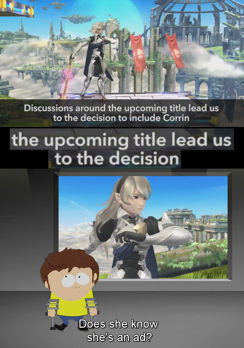 I don't mind Corrin's inclusion too much. The moves are cool, the idea of what basically amounts to a were-dragon swordsman (with a magic chainsaw sword) sounds fun... But I'm getting tired of counters. How many characters have counter moves now? 10, 11 if you count Mii Swordfighter. That's almost 1/5th of the roster.