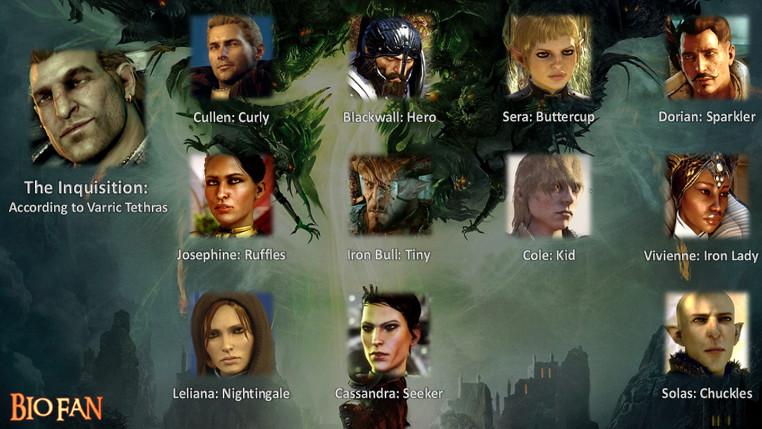 >leliana constantly tearing into cullen, cullen can't stand on his own two feet literally, cassandra still being a functioning member no matter what happens, varric who is neutered completely compared to DA2