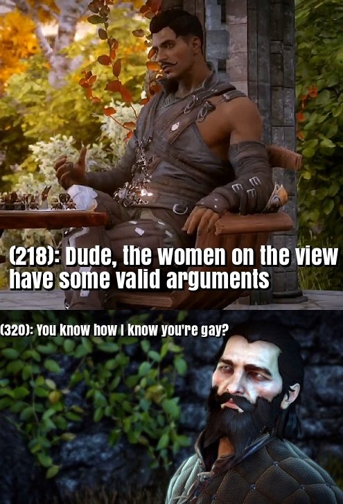 >Actually, Dragon Age has that special talent of using Party Banter to give a lot of personality to their characters. Same thing for just talking to them in camps. Blackwall and Dorian's banter in particular is always worth a listen in my opinion. Plus, while in usual circumstances, I wouldn't touch on this but, 'Praying the Gay Away'? With what is, and this isn't even Hyperbole, the equivalent of a Satanic Ritual? Not sure that translates well to SJW doctrine.