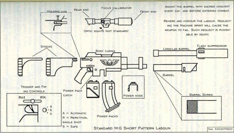 The lasgun, standard-issue to all Guardsmen, is perhaps the singular most reliable and widely used weapon in the entirety of the Imperium. Mass-manufactured at every single Forge World and supplied to all non-specialized forces, it sets the benchmark for directed energy weapons. Each forgeworld offers different designs for different purposes - the Death Korps of Krieg, for example, favoring accuracy over long range due to their doctrine of meat-grinding trench warfare are equipped with the works of their nearby Forge World Lucius, while the Elysian Drop Troops, supplied by Forge World Acctra, favor a compact, high-rate of fire design which has the firing chamber set back into the stock in a bullpup pattern. The Galaxy-pattern is the most common all across the Imperium. Ryza's never done things the right way, but it seems to be working for them.