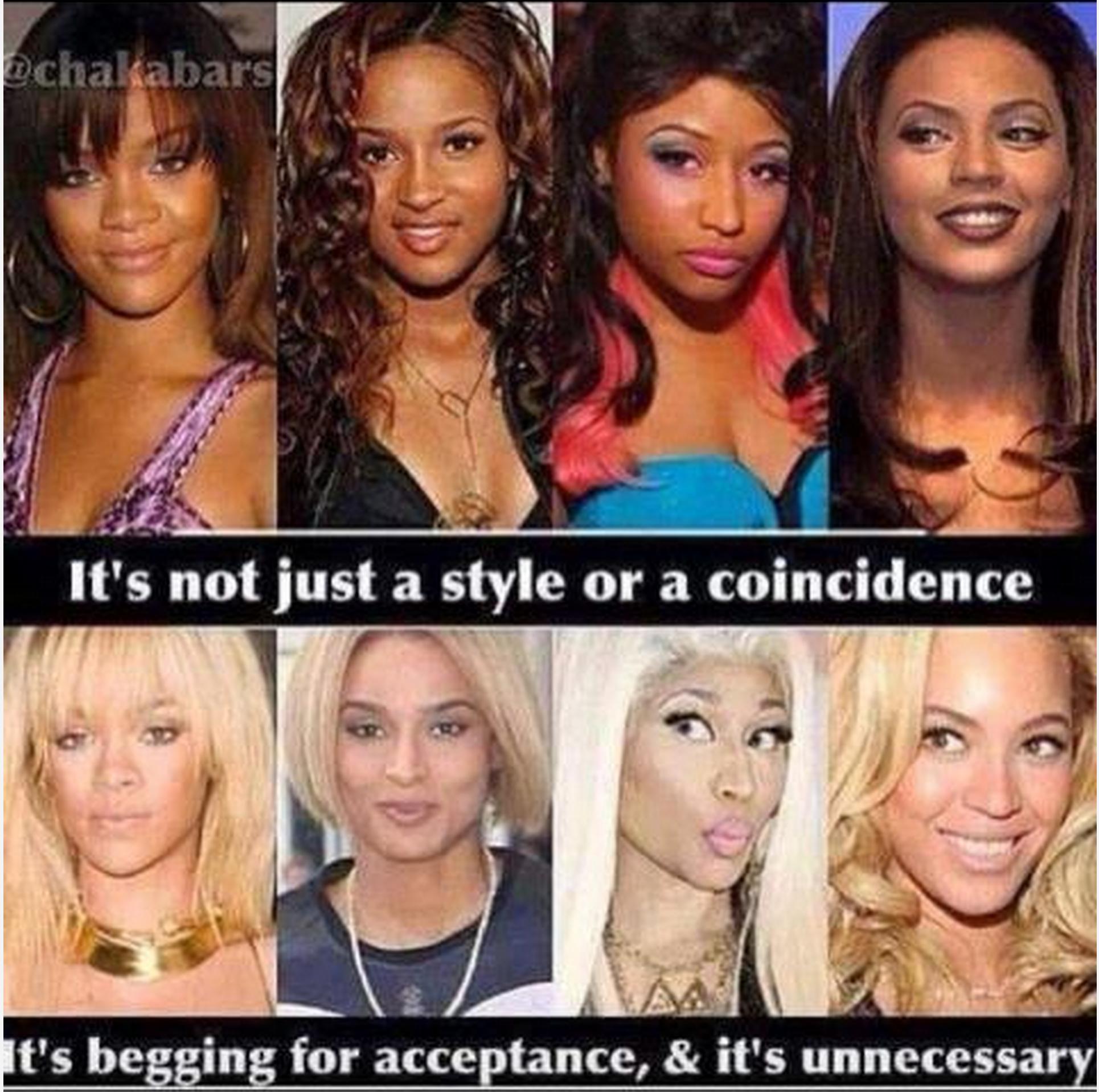 go look at a picture of all thous "beautyful woman" before they got rich. niki, rihanna and beyonce bleach thair skin and got nose jobs to get a more European nose. ive heard ******* refere to weave wearing black girls as "negropeans" and "euroblack"