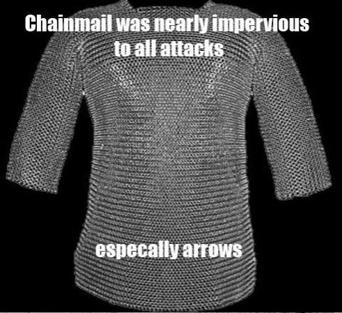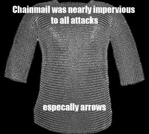 Chainmail was useless against most attacks. It was useful against slashing attacks and that was about it. Thankfully those were the most common type of attacks especially from inexperienced soldiers. It was torn apart by any kind of hacking (axes). It was easily pierced by spears, swords and arrows, and while it useually wouldnt break under crushing blows the person underneath often would. Chainmail found its greatest effectiveness when it was layered with gambeson and leather.