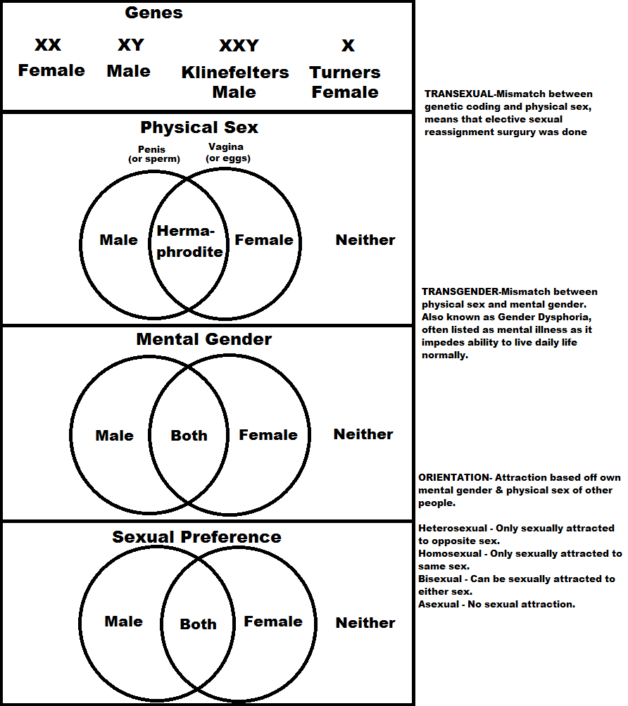 The other confusing bit is people are making up tons of sexual orientations. But the four in the image are the basic ones that cover everything. For example pansexual is just a subset of bisexual, because they can be attracted to males and females. But I'd argue that doesn't matter because it's SEXuality, which means it should depend on the physical sex of the person you are looking at. If gender mattered for sexuality, then there would be 100+ different combinations and terms. Like there would be a specific term for a male who was attracted to females who identify as both a male and female. But that'd just be a subset of somebody who was straight.