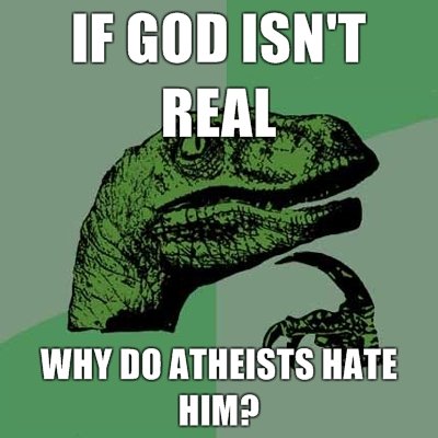 Atheism- Not believing in god, therefore we don't think "he" exists. We also refuse to tolerate other religions, or like having their followers cram their religions down our throat. You cant have feelings against something that doesn't exist.