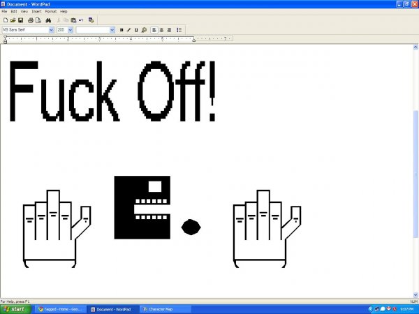Wordpad's Opinion Flag TygereyeXII (See more...) next random - Fav Favorite Comment ✖ Top NextComment (Enlarge) next Tags: Fuck Off Wordpad +1 Views: 1610 Favorited: 0 Submitted: 04/03/2009 Share On Facebook -Favorite +Favorite Unsub from TygereyeXII Subscribe to TygereyeXII