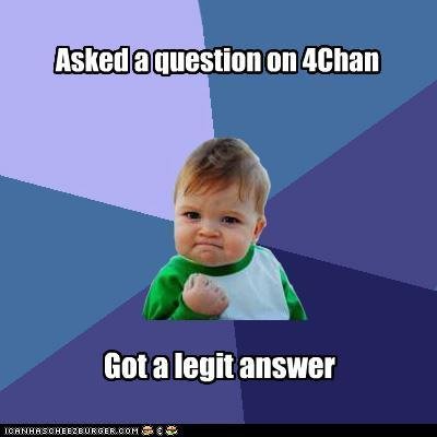Success Kid: 4Chan Flag improv (See more...) next random - Fav Favorite Comment ✖ Top NextComment OC. Made using the MemeGenerator on Memebase. next Tags: Got | a | legit | answer | on | fourchan hilit" ii' infii question on Illidan Gill 3 ' ... +12 Views: 1332 Favorited: 0 Submitted: 01/20/2011 Share On Facebook -Favorite +Favorite Unsub from improv Subscribe to improv