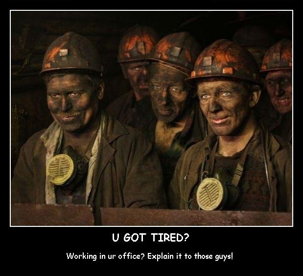 Got Tired? Flag aywo (See more...) next random - Fav Favorite Comment ✖ Top NextComment PurE OC, btw I've just felt rly sorry for those guys who spend their whole day inhaling toxic dust and working in terrible conditions, risking their life deep below the surface, so thumb if u feel the same way! next Tags: miners | Got tired U GOT TIRED? Working in LIP office? Explain it To those guys! ... +7 Views: 805 Favorited: 0 Submitted: 01/28/2011 Share On Facebook -Favorite +Favorite Unsub from aywo Subscribe to aywo