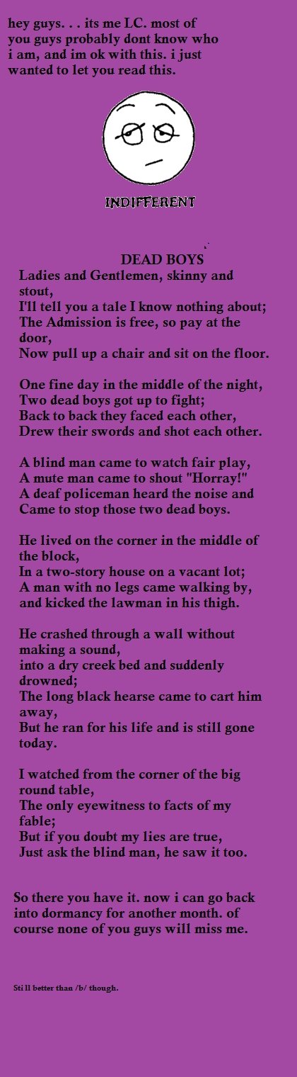 Two Dead Boys Flag lexarcommander (See more...) next random - Fav Favorite Comment ✖ Top NextComment meh, i hate descriptions next Tags: two | dead | boys | irony +19 Views: 1638 Favorited: 2 Submitted: 02/17/2011 Share On Facebook -Favorite +Favorite Unsub from lexarcommander Subscribe to lexarcommander