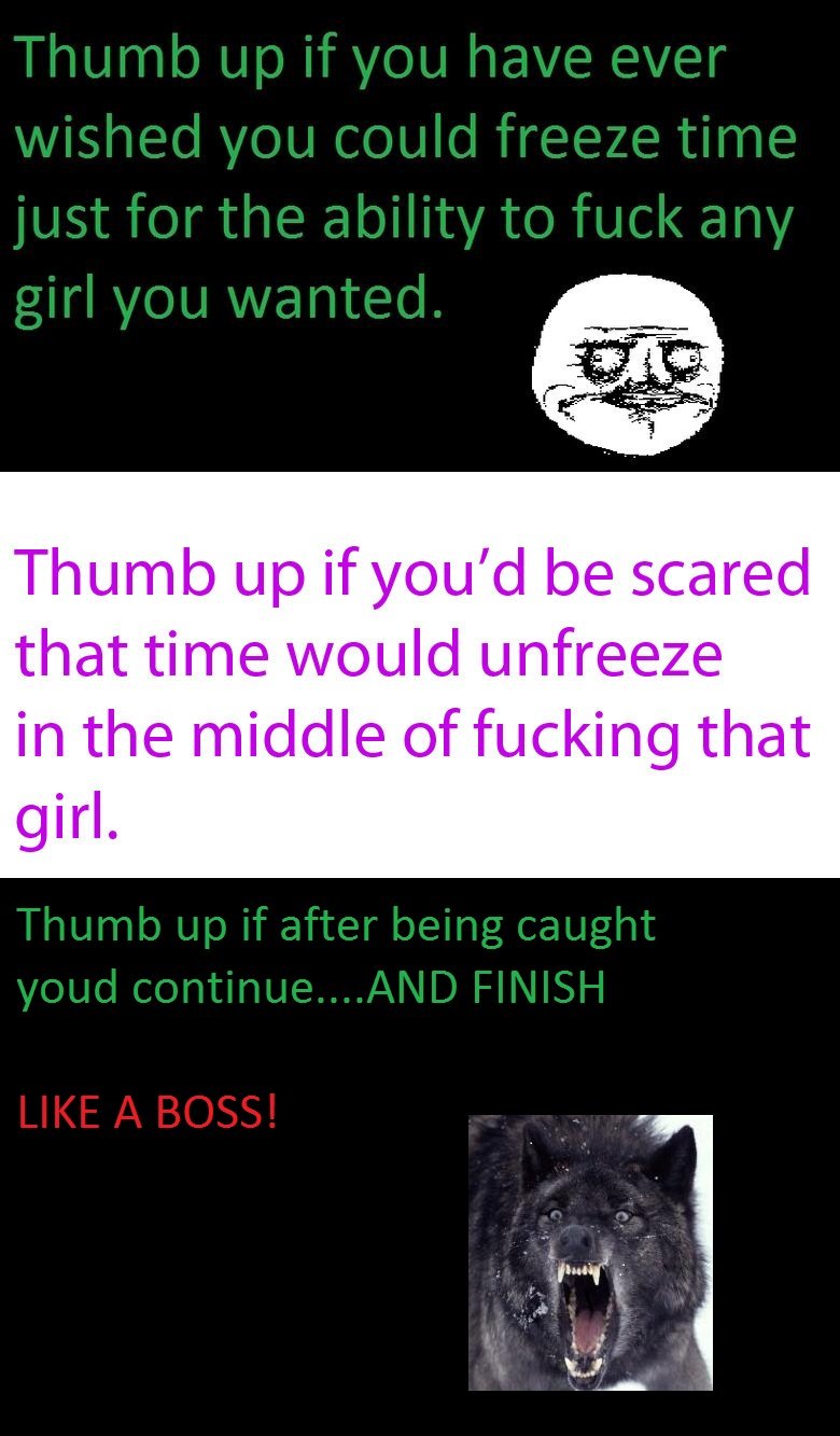 Like a boss? Flag ScottyAlexander (See more...) next random - Fav Favorite Comment ✖ Top NextComment Always finish, Ya gotsta!<br /> EDIT: You'd** next Tags: Insanity Wolf | freeze | Time | nuggets that ' l! unfreeze girl. ... +8 Views: 950 Favorited: 0 Submitted: 02/25/2011 Share On Facebook -Favorite +Favorite Unsub from ScottyAlexander Subscribe to ScottyAlexander