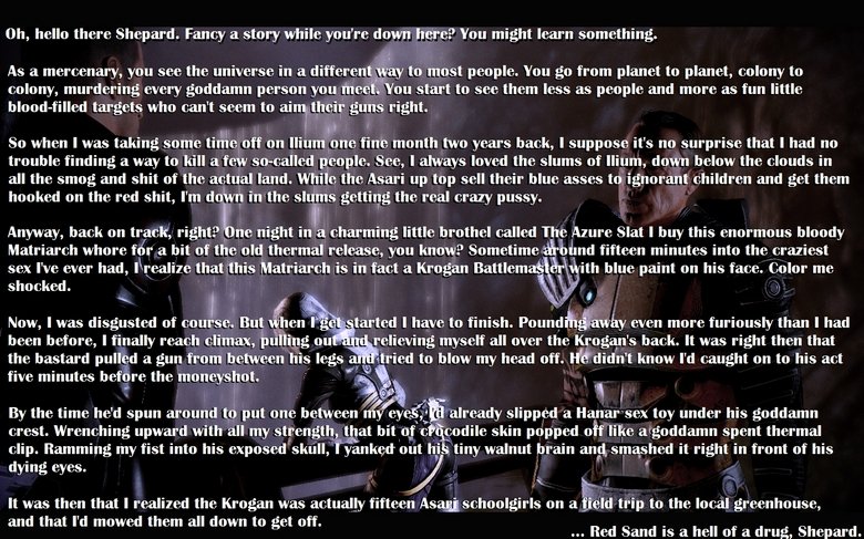 Story time with Uncle Zaeed Flag mariowithashotgun (See more...) next random - Fav Favorite Comment ✖ Top NextComment (Enlarge) A little Mass Effect humor.<br /> Not mine, but I hope you enjoy anyway.<br /> Comment and rate next Tags: my | girlfriend | beats | me | Not | as | a | sex | thing | Shes | Just | a bitch +2 Views: 2858 Favorited: 0 Submitted: 03/04/2011 Share On Facebook -Favorite +Favorite Unsub from mariowithashotgun Subscribe to mariowithashotgun