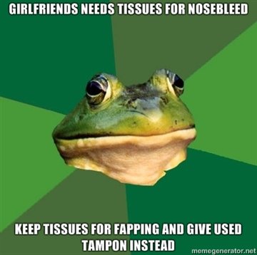Tissues Flag geodukemon (See more...) next random - Fav Favorite Comment ✖ Top NextComment This is a bit more extreme than what I usually do, but eh. New horizons, right? lol. This is OC. next Tags: foul | Bachelor | meme | lol | girlfriend TISSUES Fort KEEP MISSILES PM Hill] GIVE USER ... +14 Views: 757 Favorited: 0 Submitted: 03/05/2011 Share On Facebook -Favorite +Favorite Unsub from geodukemon Subscribe to geodukemon