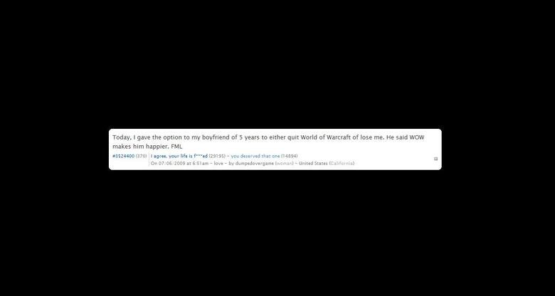 It's Me or World of Warcraft Flag ThePunisher (See more...) next random - Fav Favorite Comment ✖ Top NextComment (Enlarge) next Tags: girlfriend | boyfriend | world | of | warcraft | wow | Dumped Today, I gave the option to rm" pf It! ‘years to either quit pf Warcraft pf knee me. " said . I} W malt's him happier. Arg" ibh ... +6 Views: 6619 Favorited: 0 Submitted: 07/10/2009 Share On Facebook -Favorite +Favorite Unsub from ThePunisher Subscribe to ThePunisher