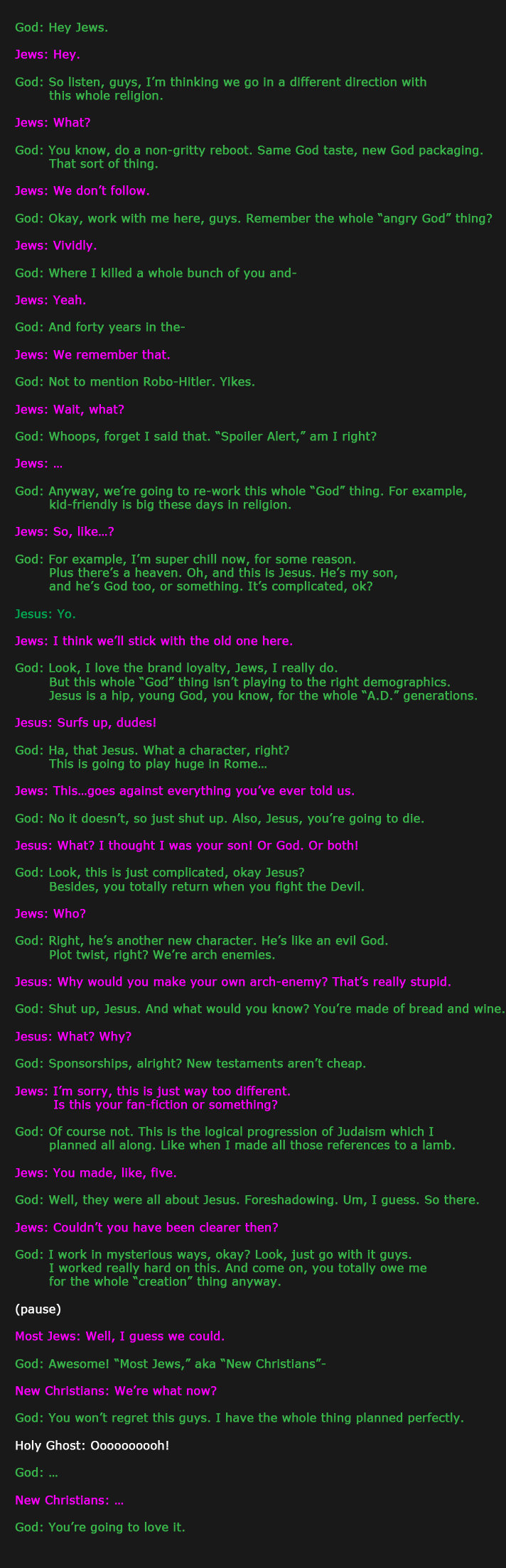 God: So listen, guys, I' m thinking we go in a different direction with