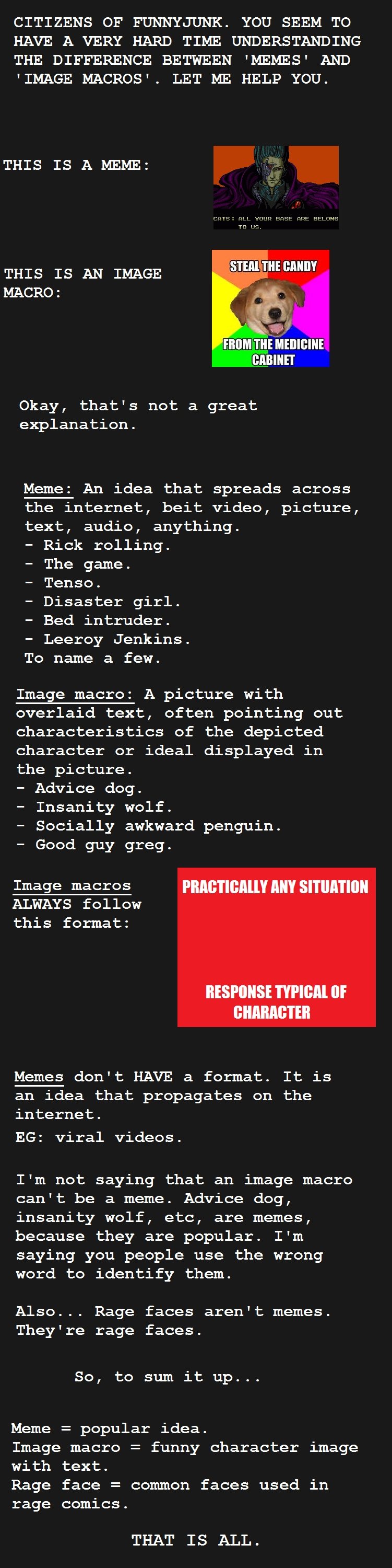 Image macros vs. memes. Adjust content blocking kyzfrintin next random Comment Top NextComment Annoys me that people are getting this wrong. next Tags: meme | image | macro | rage | Face CITIZENS OF FUNNYJUNK. YOU SEEM TO HAVE A VERY HARD TIME UNDERSTANDING THE DIFFERENCE BETWEEN 'MEMES' AND IMAGE MACROS'. LET ME HELP YOU. THIS IS A MEME: THIS TS AN IMAGE MACRO: - ftt ttr- manna Okay, that' s not a great: explanation. Meme: An idea that spreads across the internet, beit video, picture, text, audio, anything. Rick rolling. The game. Tenso. Disaster girl. Bed intruder. Leeroy Jenkins. To name a few. Image macro: A picture with overlaid text, often pointing out: characteristics of the depicted character or ideal displayed in the picture. Advice dog. Insanity wolf. Socially awkward penguin. Good guy greg. Image macros mu SITUATION ALWAYS follow this format: Dyf% III Memes don' t HAVE a format. It is an idea that propagates on the internet. viral videos. I' m not saying that an image macro can' t be a meme. Advice dog, insanity wolf, etc, are memes, because they are popular. I' m saying you people use the wrong word to identify them. Also... Rage faces aren' t memes. They' re rage faces. Meme = popular idea. Image macro = funny character image with text. Rage face = common faces used in rage comics. THAT IS ALL. ... +20 Views: 23817 Submitted: 10/18/2011 Facebook Twitter Google+ Tumblr Pinterest