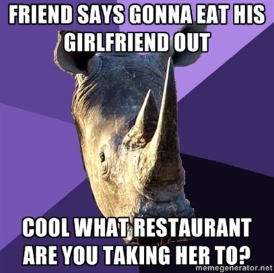 Sexually Oblivious Rhino Flag darkwingdog (See more...) next random - Fav Favorite Comment ✖ Top NextComment this was a true story. i was at a mcdonalds and i heard him say gonna take my girlfriend out to eat but he really said gonna eat my girlfriend out. and i did say the bottom line next Tags: girlfriend | restaurant | eat FRIEND SAYS ERINNA EAT HIS ... +16 Views: 864 Favorited: 0 Submitted: 12/05/2011 Share On Facebook -Favorite +Favorite Unsub from darkwingdog Subscribe to darkwingdog
