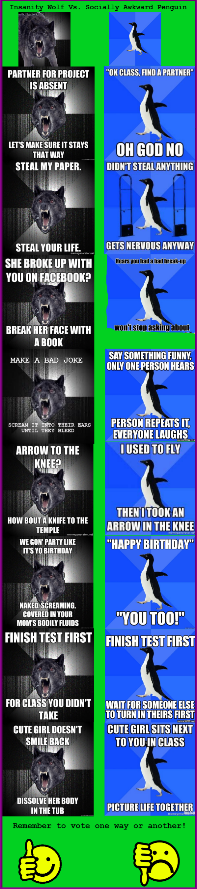 Insanity Wolf and Socially Awkward Penguin give you their opinions on different scenarios and topics!