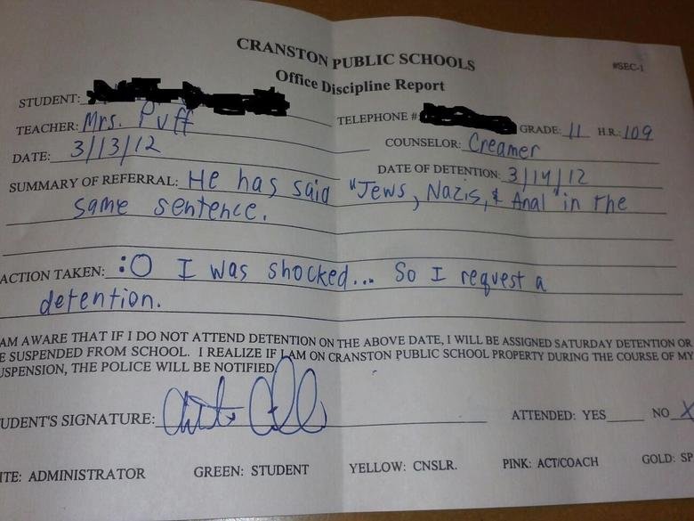 Detention slip Flag themaxruler (See more...) next random - Fav Favorite Comment ✖ Top NextComment (Enlarge) Was on FB a kid from my school. next Tags: OC | detention | Teacher | lol | jews +1 Views: 4064 Favorited: 0 Submitted: 04/02/2012 Share On Facebook -Favorite +Favorite Unsub from themaxruler Subscribe to themaxruler