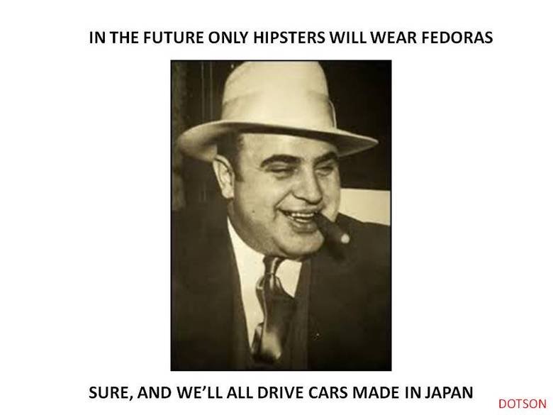 CAPONE2 Flag dotsonmac (See more...) next random - Fav Favorite Comment ✖ Top NextComment (Enlarge) next Tags: OC IN THE FUTURE ONLY HIPSTERS WILL WEAR FEDORAS SURE, AND WE' LL ALL DRIVE CARS MADE IN JAPAN DOTSON ... +7 Views: 548 Favorited: 0 Submitted: 04/02/2012 Share On Facebook -Favorite +Favorite Unsub from dotsonmac Subscribe to dotsonmac