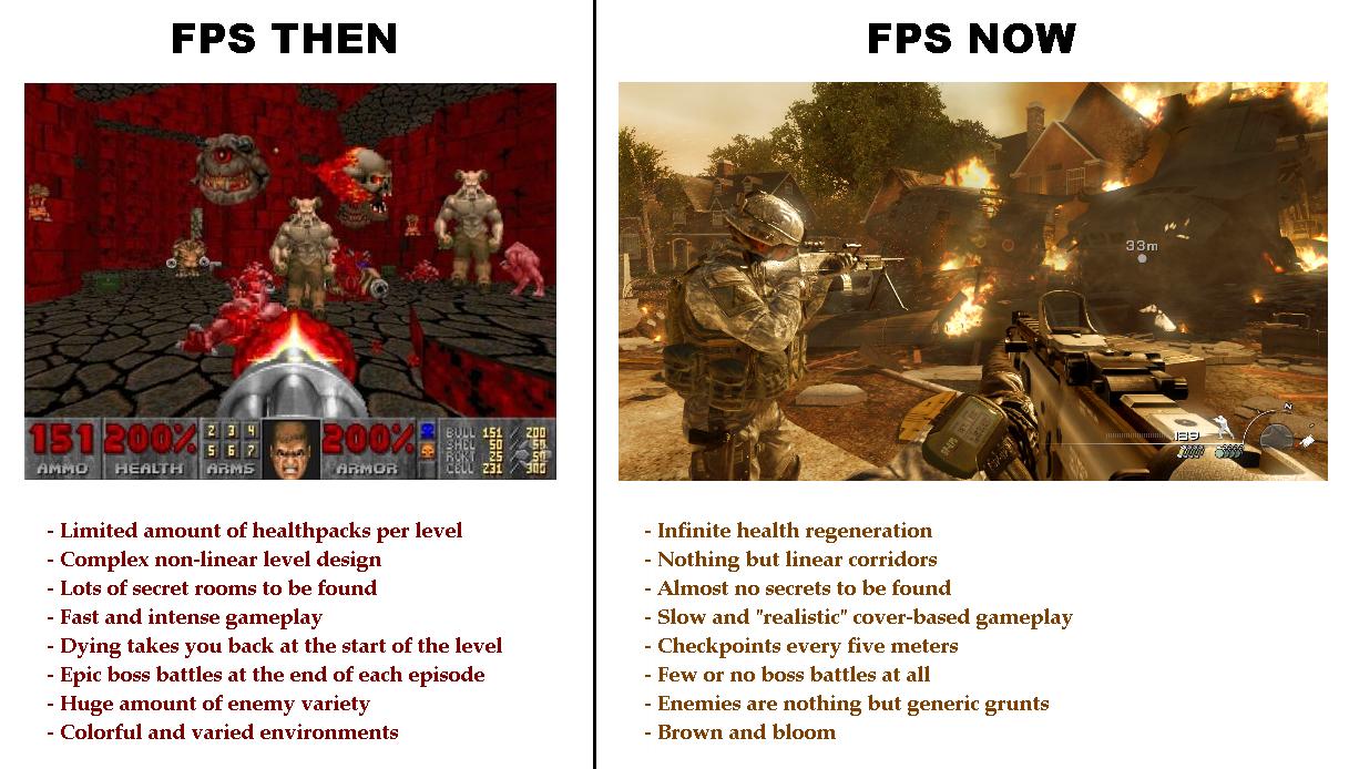 For one, MW2 is a war shooter, of course enemies aren't going to vary. Also, what type of boss battle would there be. If you compared to doom to halo, then their would be a variety of enemies. Honestly, that compare/contrast picture is BS. Im not saying i love COD, but that is picture is just exaggerating.