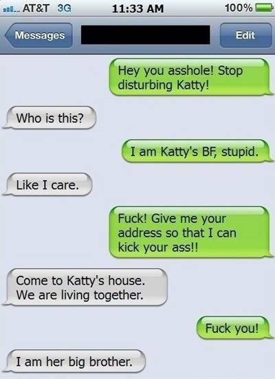BF Fail Flag RomanR (See more...) next random - Fav Favorite Comment ✖ Top NextComment next Tags: iPhone | douchebag | fail | girlfriend | boyfriend | dickbutt I Messages I Like I care. i Who is this? I l Cemo' Kati: y' s house. We are living together. i I am her big brother. 1 ... +4824 Views: 89155 Favorited: 232 Submitted: 06/15/2012 Share On Facebook -Favorite +Favorite Unsub from RomanR Subscribe to RomanR