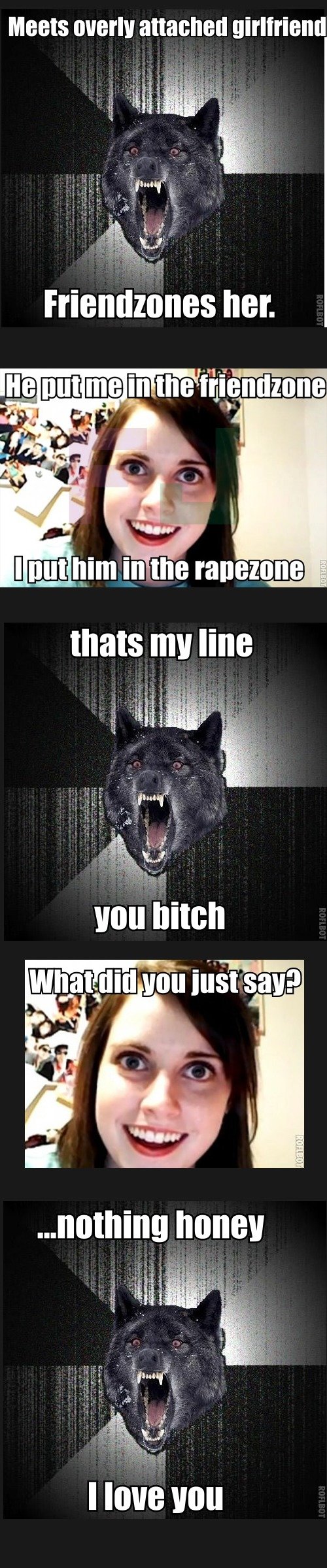 Hey, even Insanity Wolf's gotta have standards. Raping a woman with a rake is fine while they're dating, but cutting her into pieces ought to wait until marriage. ;)