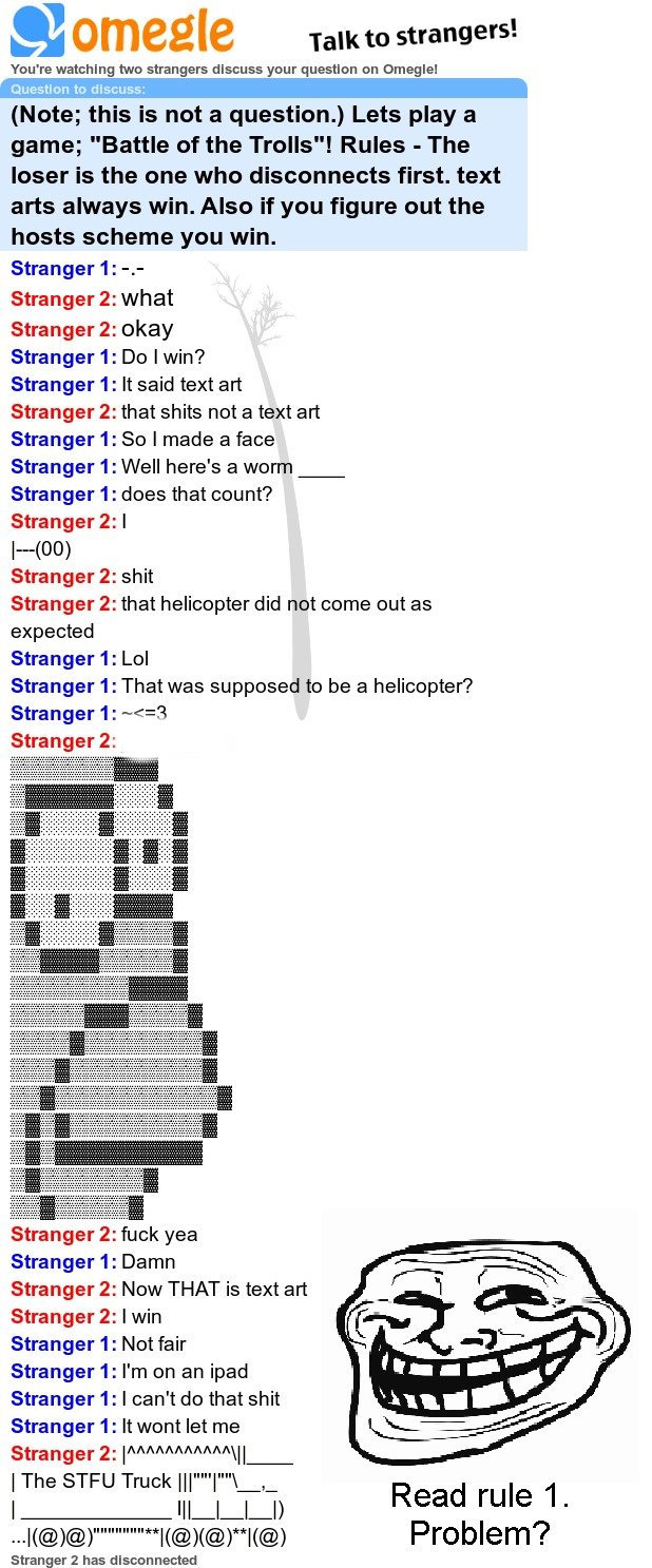 TROLL WARS - They fell for it! Flag gracefulgrace (See more...) next random - Fav Favorite Comment ✖ Top NextComment Carefully read it. +15 at least for a sequel. next Tags: Stupid | first | dont | know | or | care | post | they | fell | for | it | rick | roll | never | gonna | give | You +1 Views: 1108 Favorited: 0 Submitted: 08/04/2012 Share On Facebook -Favorite +Favorite Unsub from gracefulgrace Subscribe to gracefulgrace