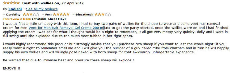 i would highly recommend this product but strongly advise that you purchase two sheep if you want to last the whole night! if you