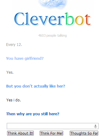 fuck you cleverbot Flag datsomebullshit (See more...) next random - Fav Favorite Comment ✖ Top NextComment next Tags: Cleverbot | burn | girlfriend | 12 Every 12. Vern have girlfriend? Yes. But you don' t actually like her? Yes i do. Then why are you still here? ... +12 Views: 1556 Favorited: 0 Submitted: 10/27/2012 Share On Facebook -Favorite +Favorite Unsub from datsomebullshit Subscribe to datsomebullshit