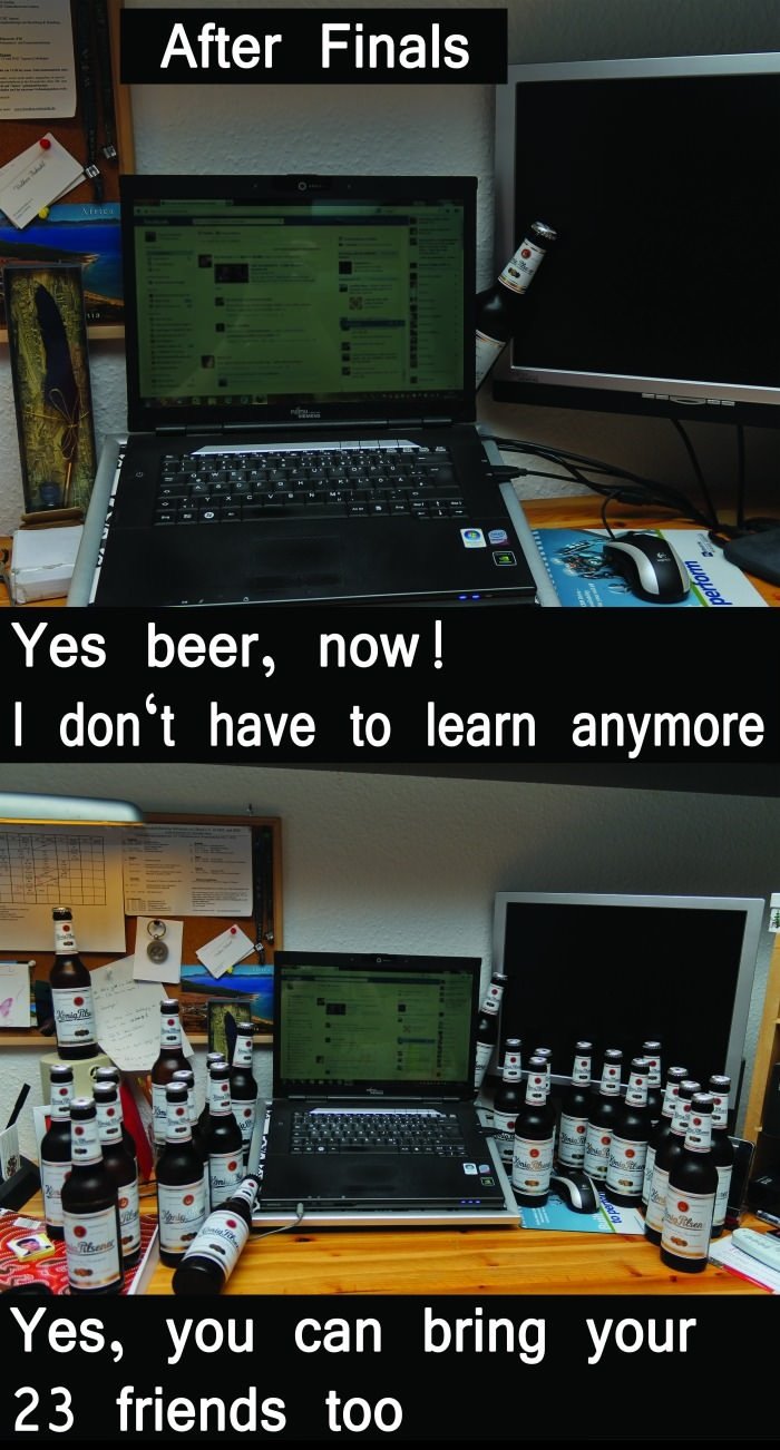 Finally, after Finals Flag evilhomer (See more...) next random - Fav Favorite Comment ✖ Top NextComment next After Finals #1.. Yes beer, now! I dont have to learn anymore 23 friends too ... +2081 Views: 65112 Favorited: 78 Submitted: 02/06/2013 Share On Facebook -Favorite +Favorite Unsub from evilhomer Subscribe to evilhomer