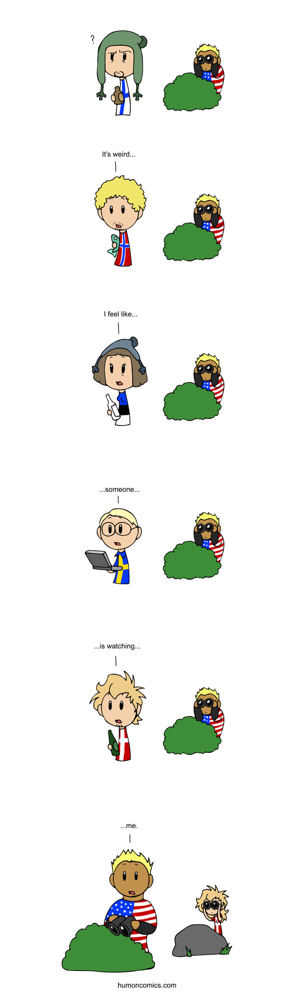 "The big story around here these days is that America have been spying on civilians in European countries without informing the government. It all started when Norway found out about it, and then other countries started looking into it and found that Americans had indeed been spying on civilians in their country.