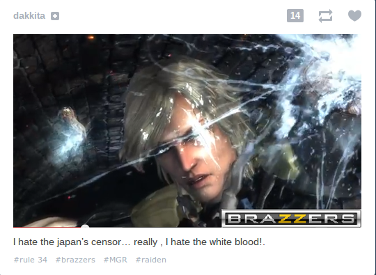 Metal Gear Tumblr Flag thepedomexican (See more...) next random - Fav Favorite Comment ✖ Top NextComment its like the person wants to be hated by the rest of Tumblr? Raidens blood is supposed to be white! next Tags: metal | Gear | rising | raiden | Japan | tumblr I hate the ' e ::eraser._. really . I hate the white t: -leech- ... +25 Views: 3341 Favorited: 1 Submitted: 02/28/2013 Share On Facebook -Favorite +Favorite Unsub from thepedomexican Subscribe to thepedomexican