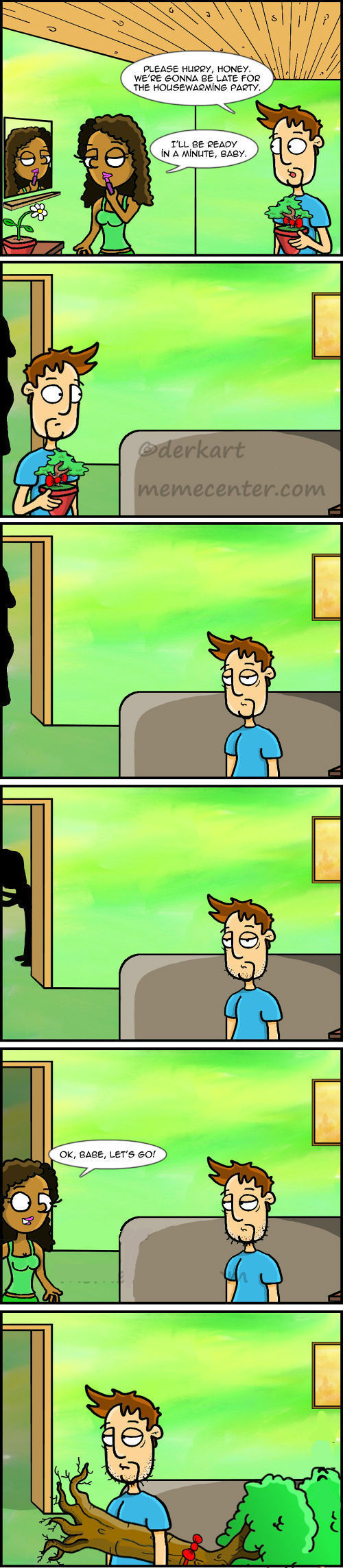 In the first frame, it's a little baby potted tree (house warming gift). By the time she finishes getting ready it's a full grown tree.