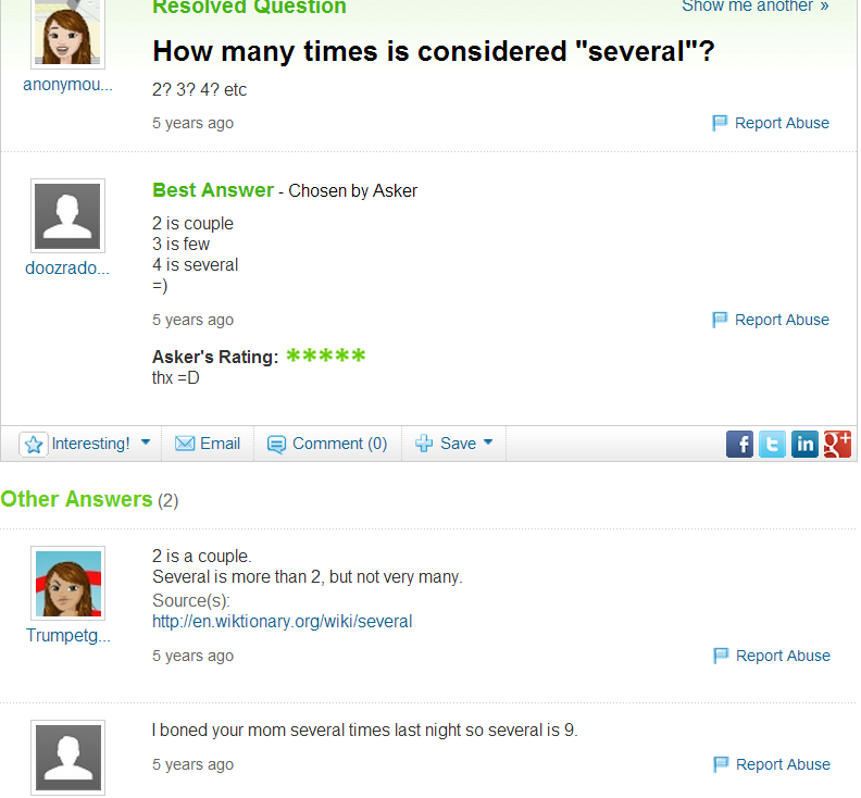 I boned your mom several times last night so several is 9.