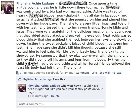 This is how a 16 year old gets back at a trolling 13 year old. Yeah, sure, his family won't mind those appendages... BTW, I am supposed to be Akinta, but LOL, I am a fox, not a bear! And, I don't eat children.