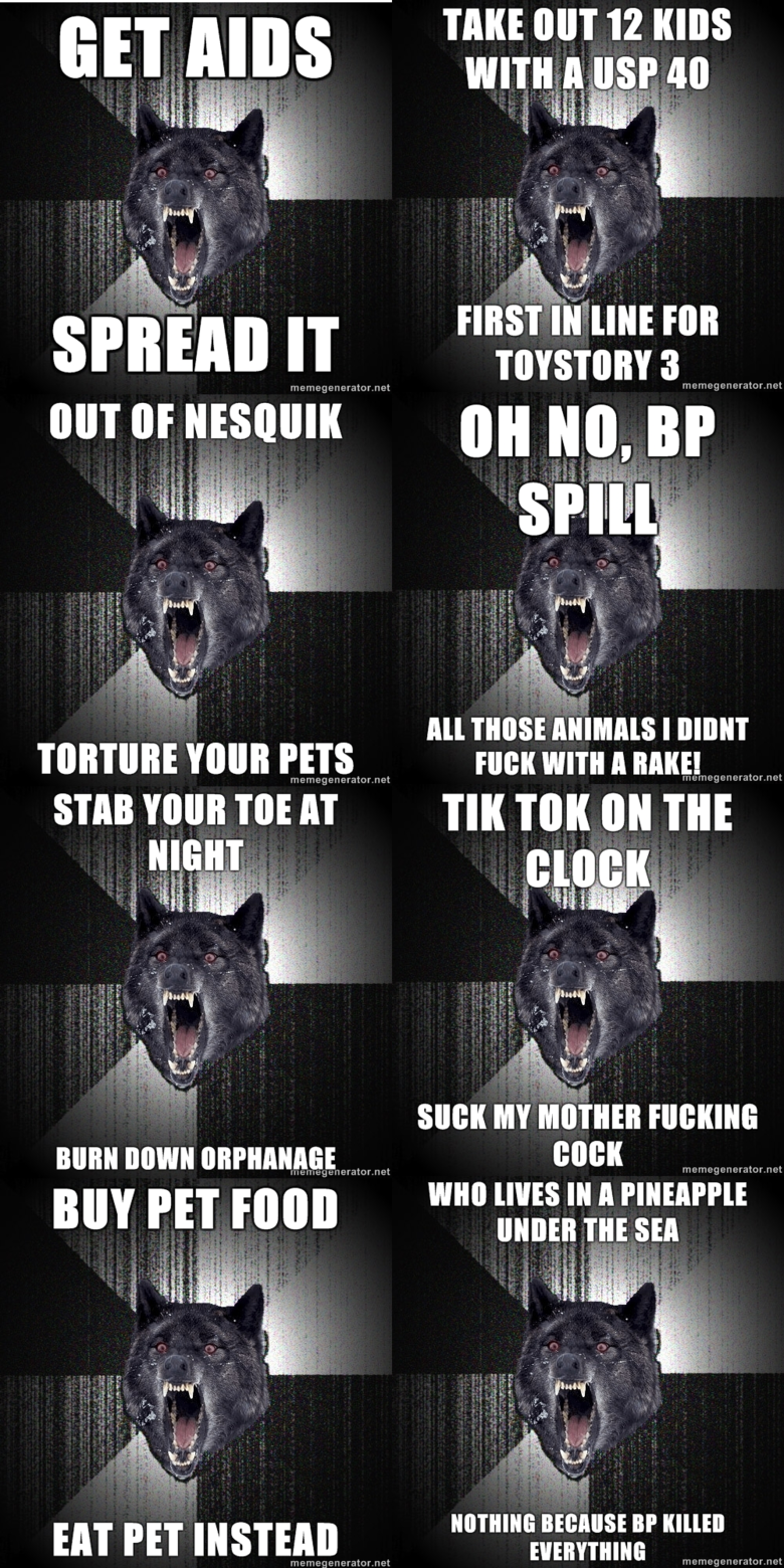Insanity Wolf Flag mthree (See more...) next random - Fav Favorite Comment ✖ Top NextComment (Enlarge) Part 2- /funny_pictures/525630/Insanity+Wolf+Part+Two/ next Tags: Insanity | Wolf | Rape +37 Views: 4771 Favorited: 3 Submitted: 06/15/2010 Share On Facebook -Favorite +Favorite Unsub from mthree Subscribe to mthree