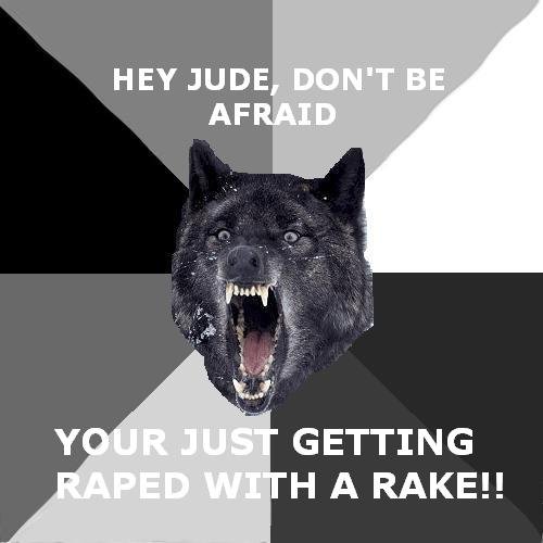 Insanity wolf on the Beatles Flag imsofakingwetardid (See more...) next random - Fav Favorite Comment ✖ Top NextComment if you thought this was funny thumb it up next Tags: Insanity | Wolf | meme | funny | Beatles | rake HEY JUDE f GETTING H A RAKE! ... +5 Views: 2249 Favorited: 2 Submitted: 06/15/2010 Share On Facebook -Favorite +Favorite Unsub from imsofakingwetardid Subscribe to imsofakingwetardid