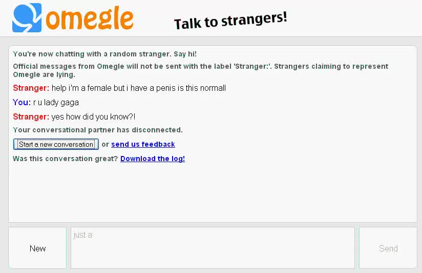 Must be lady Gaga Flag seansoccer (See more...) next random - Fav Favorite Comment ✖ Top NextComment i was on omegle and this person said this and i thought it must be lady Gaga. 100 thumbs i keep looking for more funny omegle convos next Tags: lady | gaga | omegle | funny -4 Views: 1239 Favorited: 0 Submitted: 08/28/2010 Share On Facebook -Favorite +Favorite Unsub from seansoccer Subscribe to seansoccer Download
